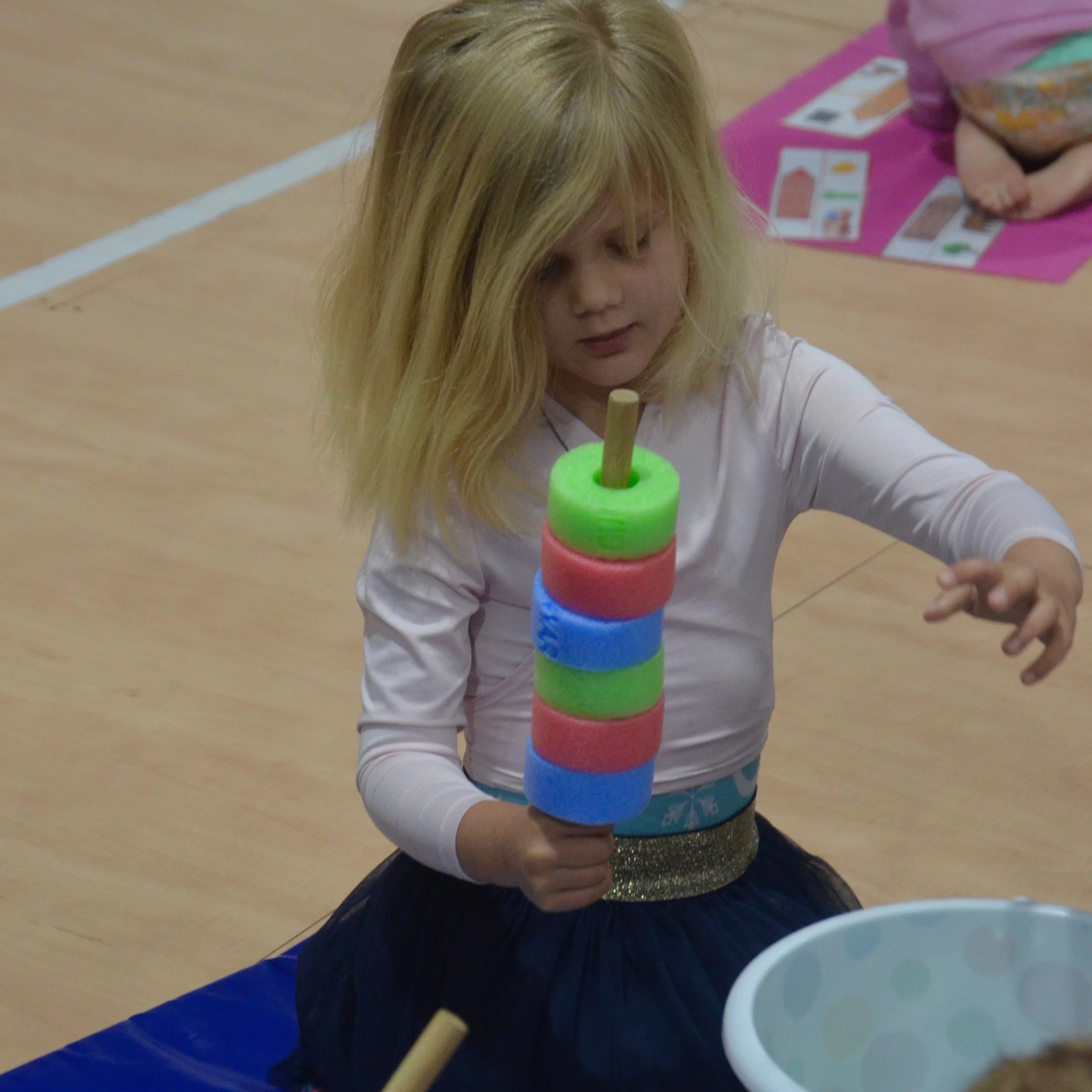 In this developmental stage, when children are so open to learning, we know that we also have the opportunity to incorporate foundational concepts, like colours, shapes and numbers! We have lots of fun counting out loud, matching counting to rhythm, sorting colours and building with shapes.